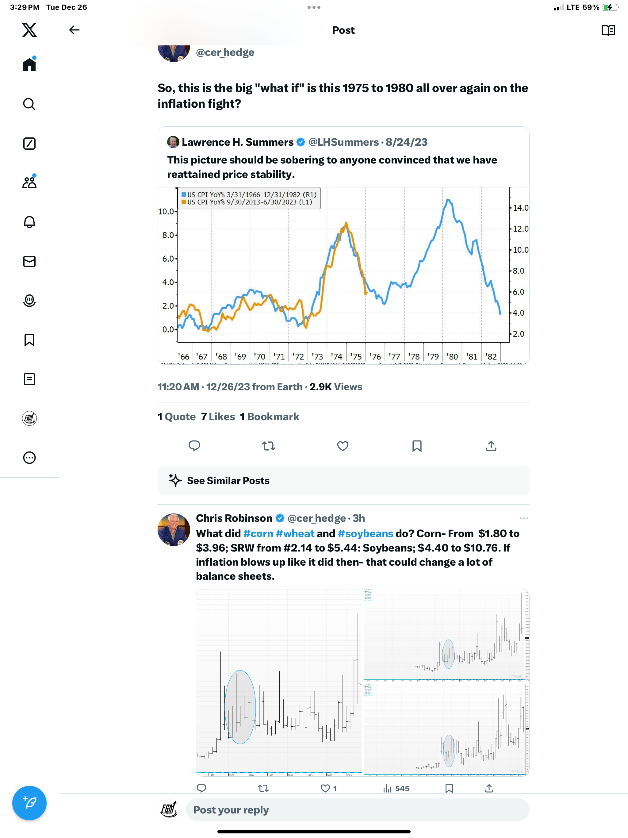 Take a look at some of the talk on inflation in the screen shot below and what happened to corn, soybeans, and wheat price from 1975-1980. A percentage move like that on our present prices would be surprising. Not probable but possible.