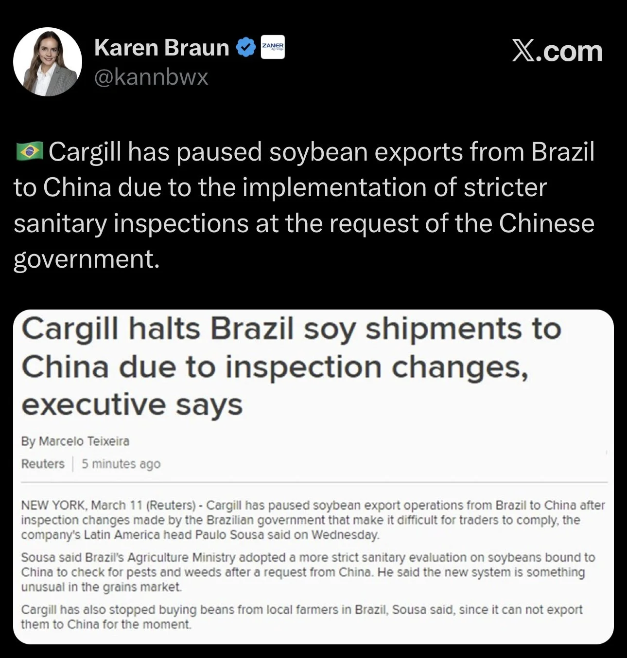 We also had news out that Cargill has halted their soybeans exports from Brazil to China due to sanitary inspections.
