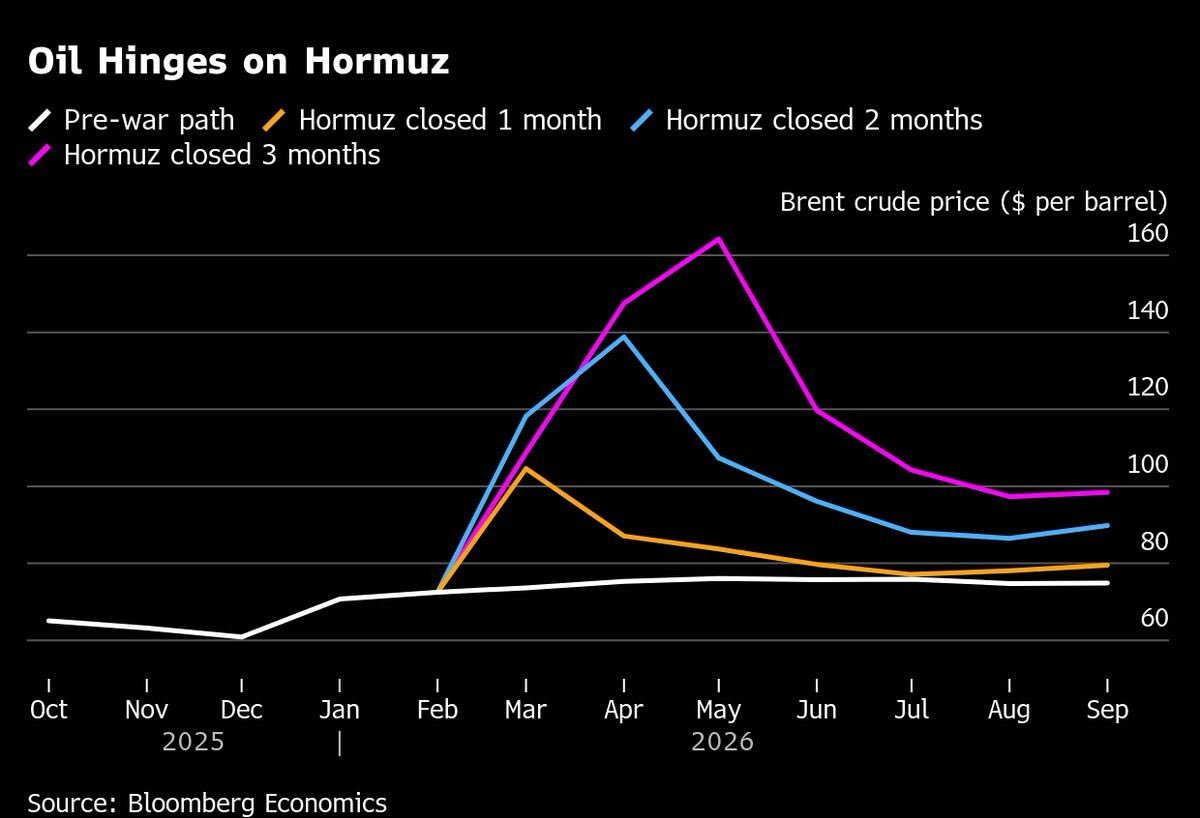 It shows how the price of crude could be impacted based on how long the Strait of Hormuz stays shut down.