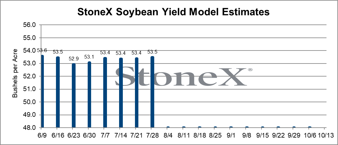 Along with corn, the trade expects record yield for beans. StoneX has 53.5 bpa.