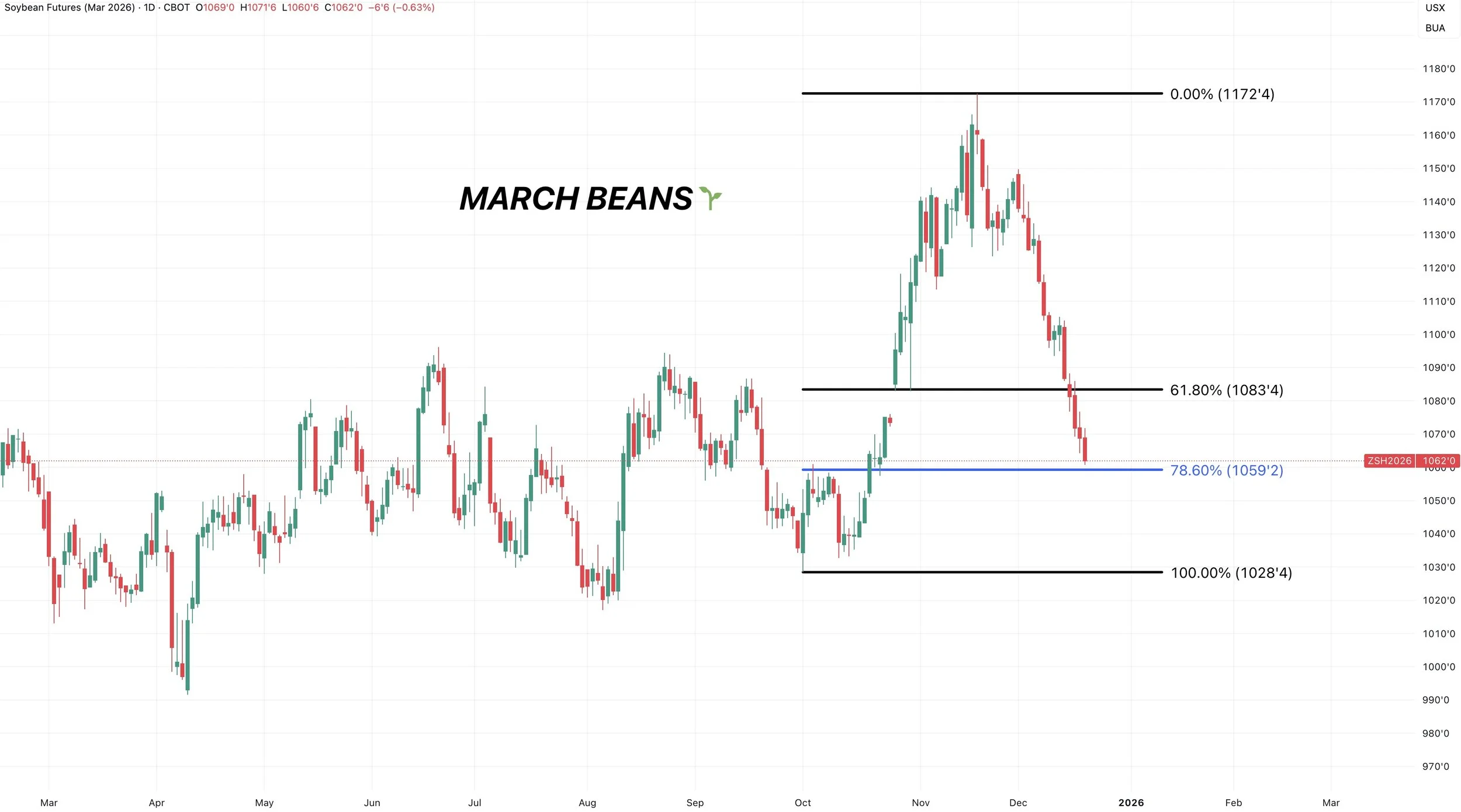March soybeans are nearing that 78.6% level from the entire China rally as well.