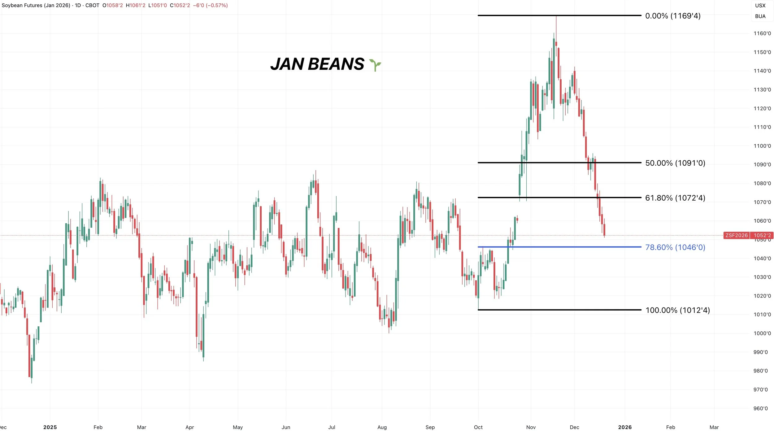 This is the active daily continuation chart, which currently shows Jan soybeans.