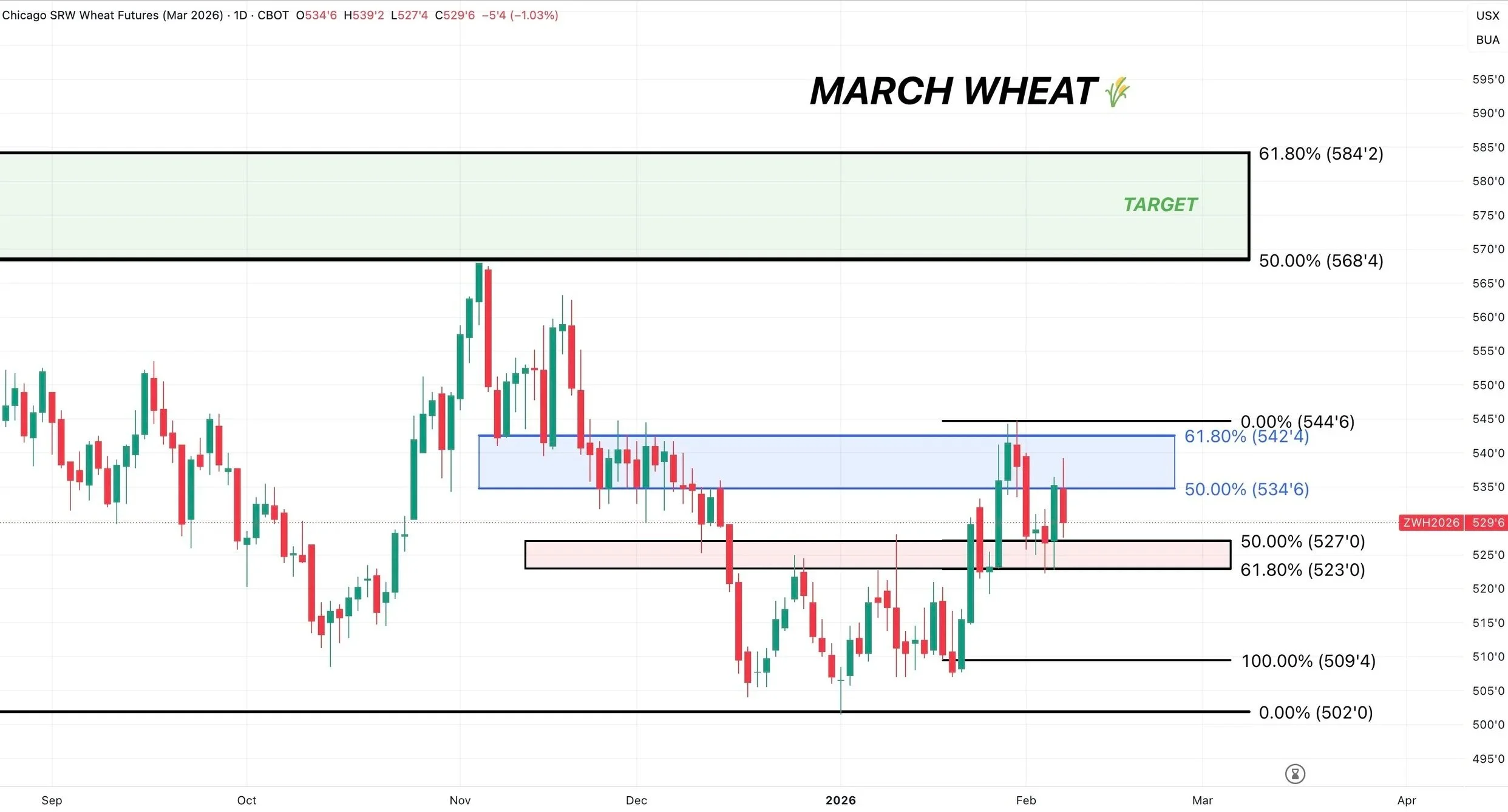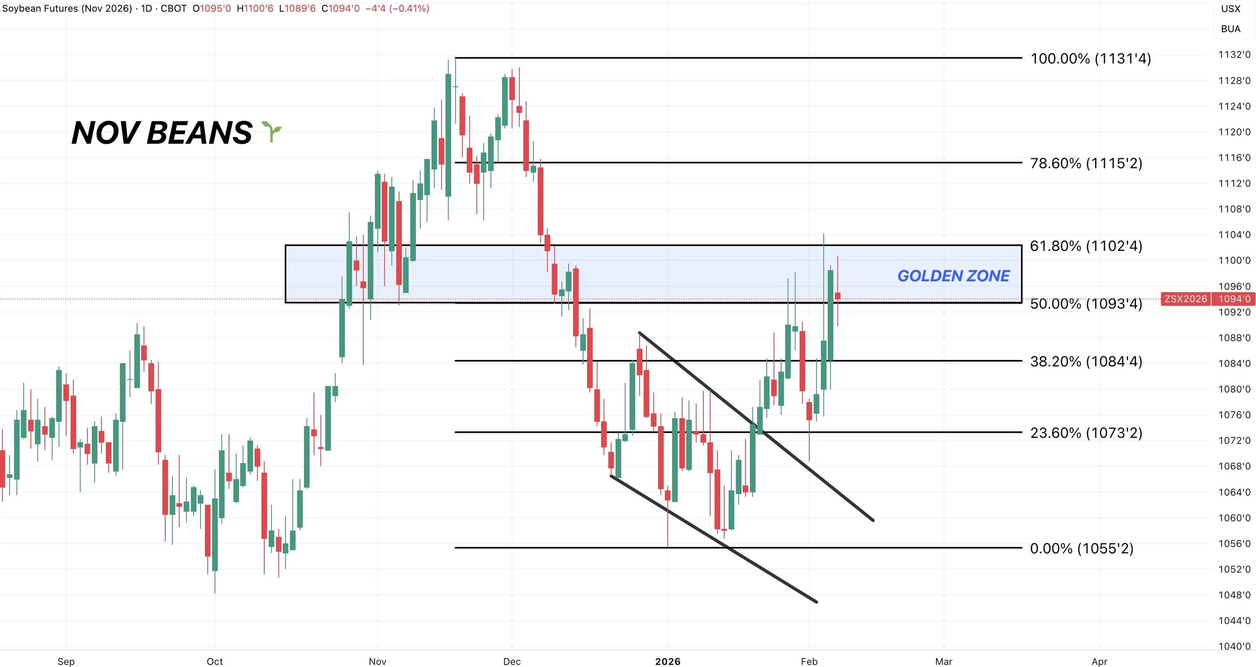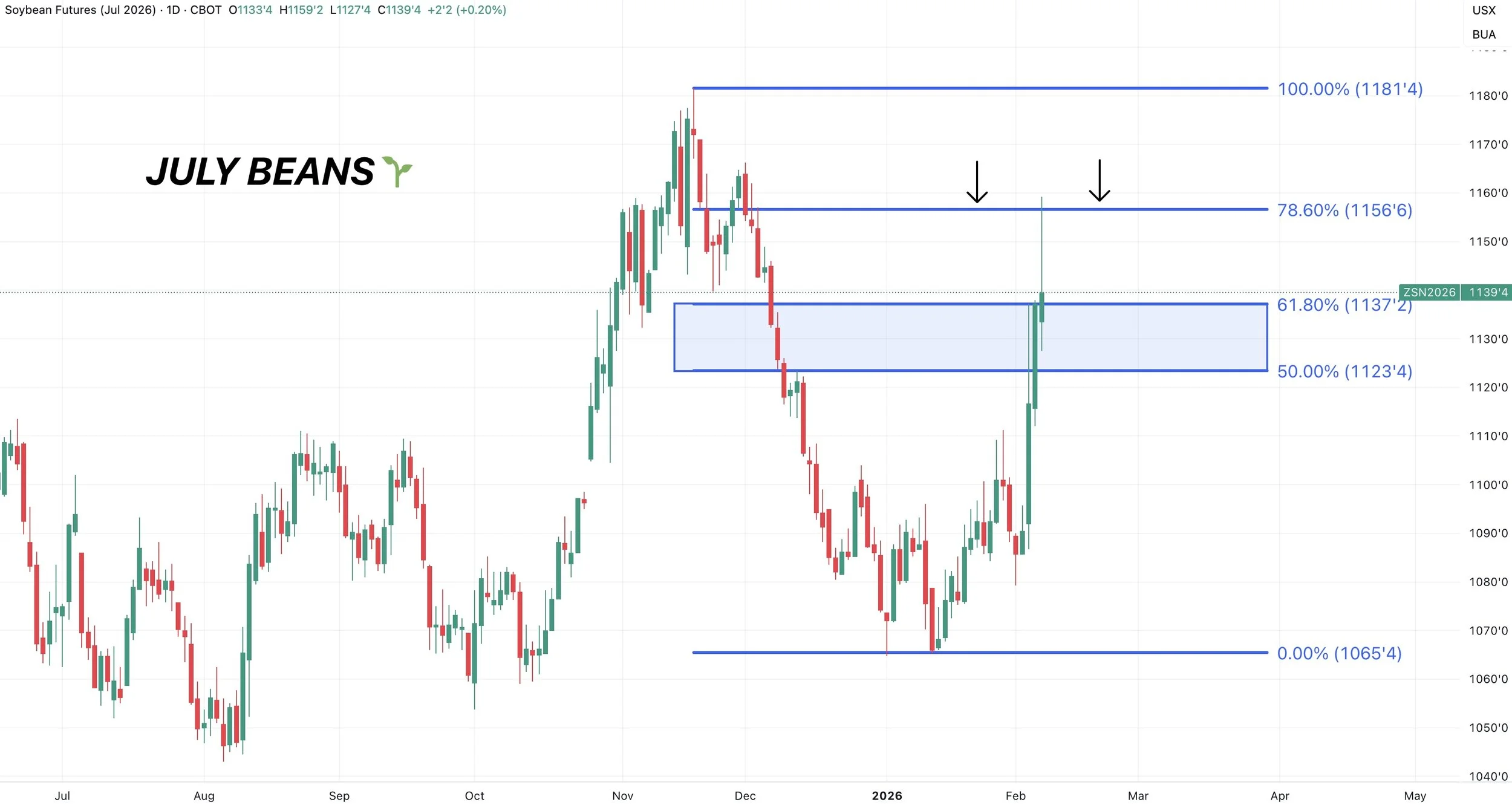 March, May, and July soybeans were all approaching our secondary targets. The 78.6% retracment levels up to the November highs.