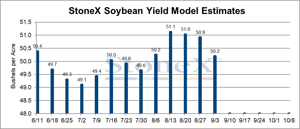 Here is StoneX's most recent yield estimate from Arlan Suderman for beans. Their estimate is 50.2 bpa, down from last week's 50.9 bpa. He actually said that this is the type of year where he would expect his yield models to over estimate yields. So he is essentially saying that a 50 bpa yield, is likely too high.