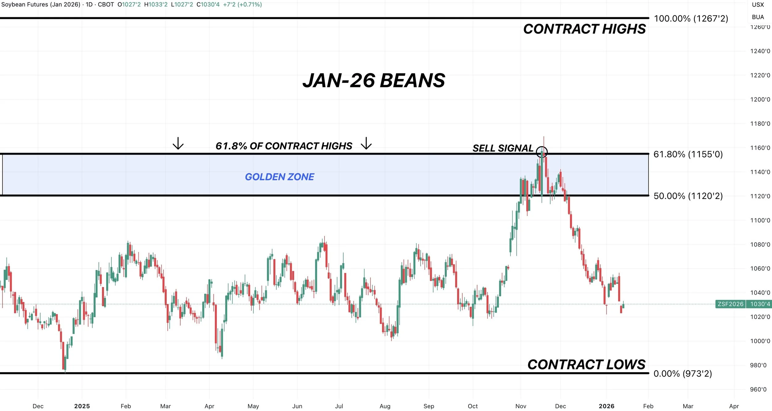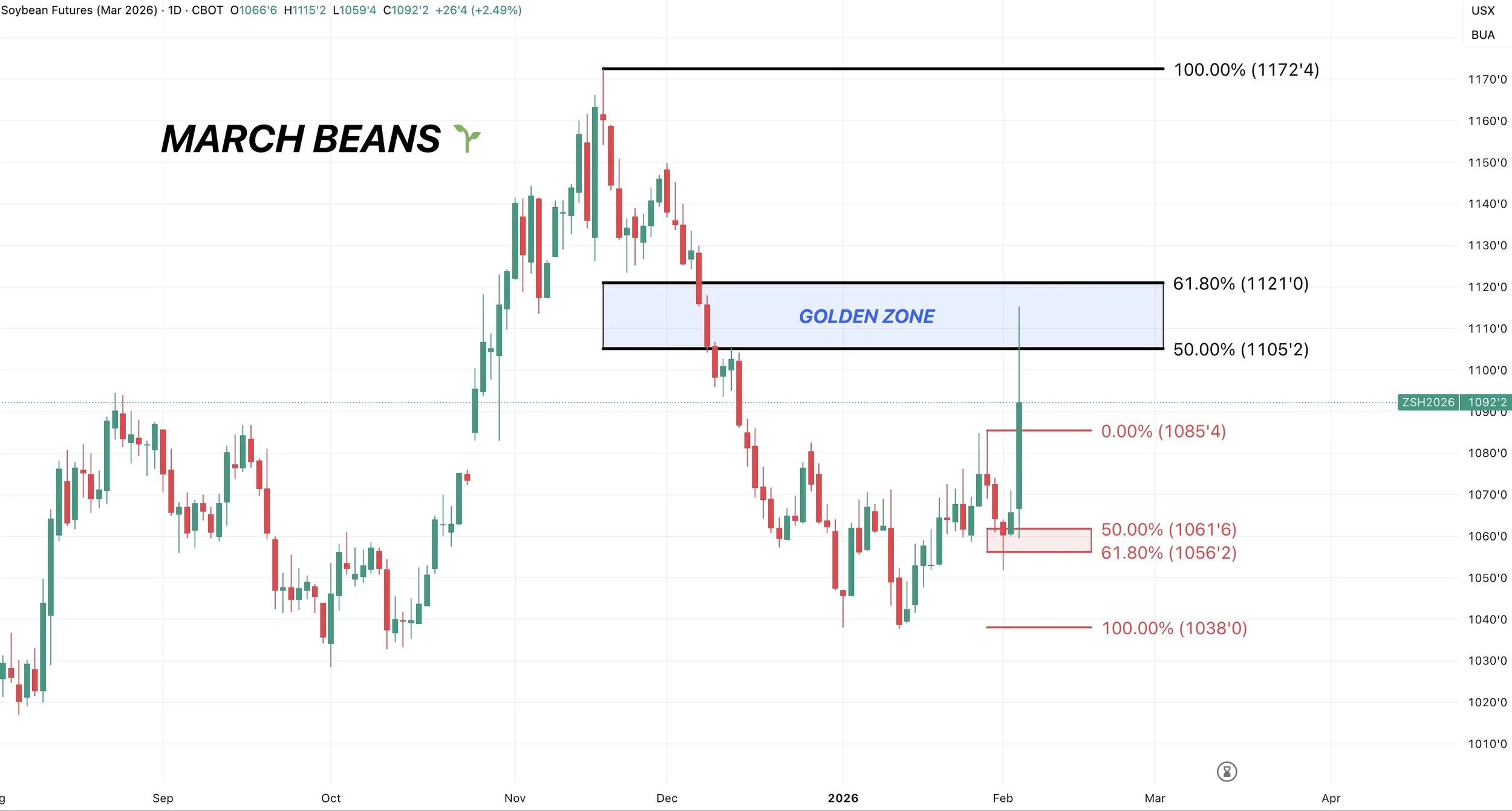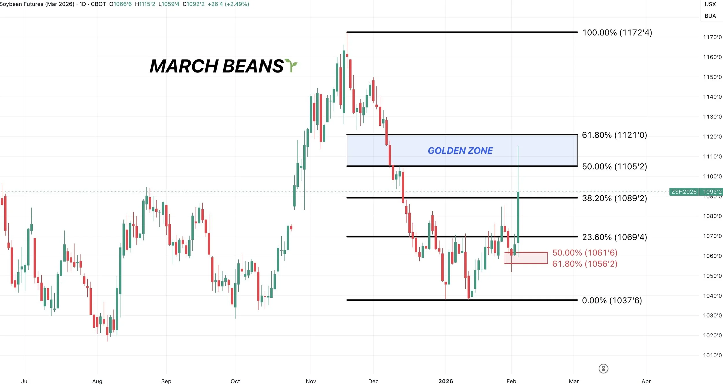 If we look at March soybeans, we alerted the signal because we hit the golden zone.