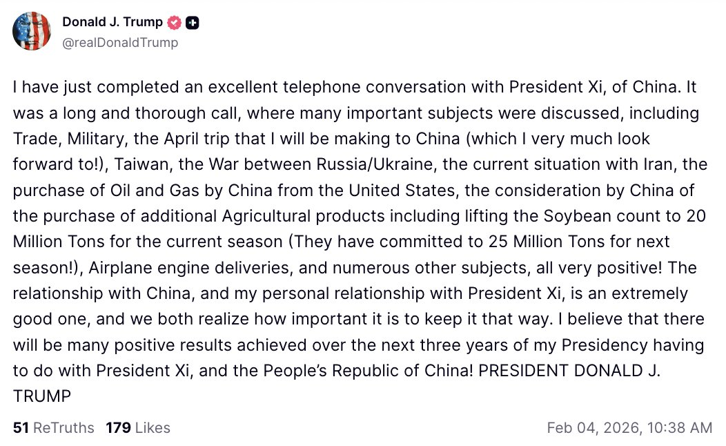 He had a call with China. He essentially said that they discussed China bumping their soybean purchase agreement from 12 million metric tons to 20 million metric tons.