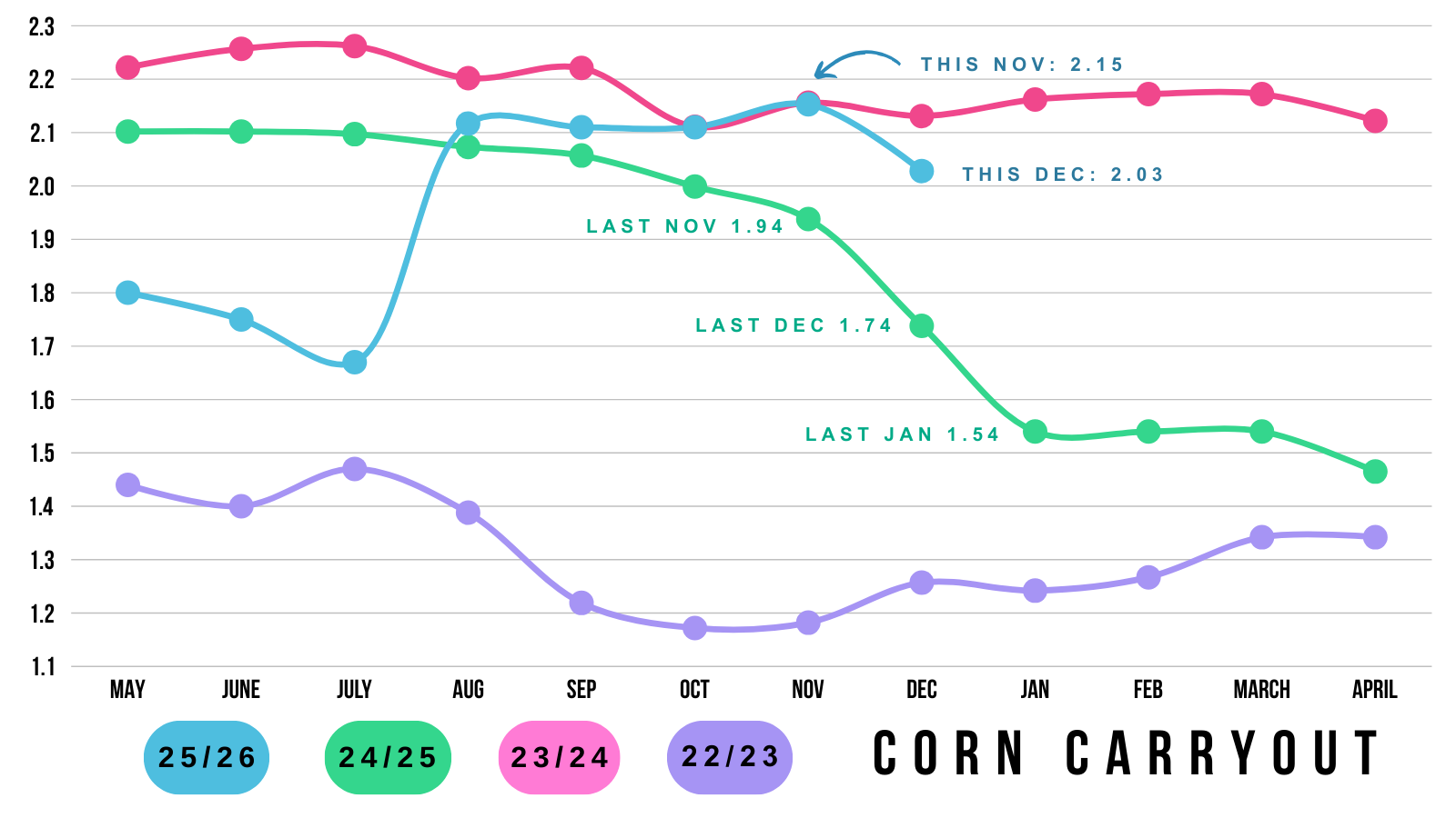 This was the 2nd largest drop we've seen to corn carryout for the Dec report in the last decade. Only behind last year's -200 million drop.