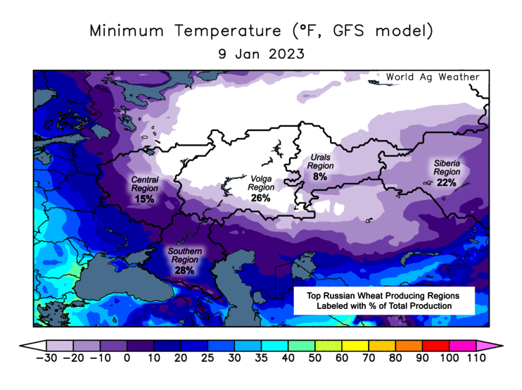 Now for the world's number 1 exporter of wheat. Russia. We already know they have a rather large crop. But they are facing some possible complications this coming week with possible winter kill. As they will have extremely cold temps with no snow cover. We will have to see how much damage their crop sees, but nonetheless this is a potential bullish factor.