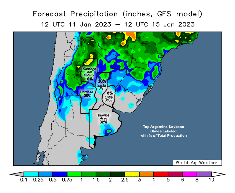 The first one is Argentina weather and forecasts. Some are saying Argentina might get up to an inch of rain next week. Any sign of rain pressures the soybean market. While continued dryness will support prices. Overall, the forecasts are still pretty dry. But, they are expected to see some rains this week. So we will have to see how much they get or don't get.