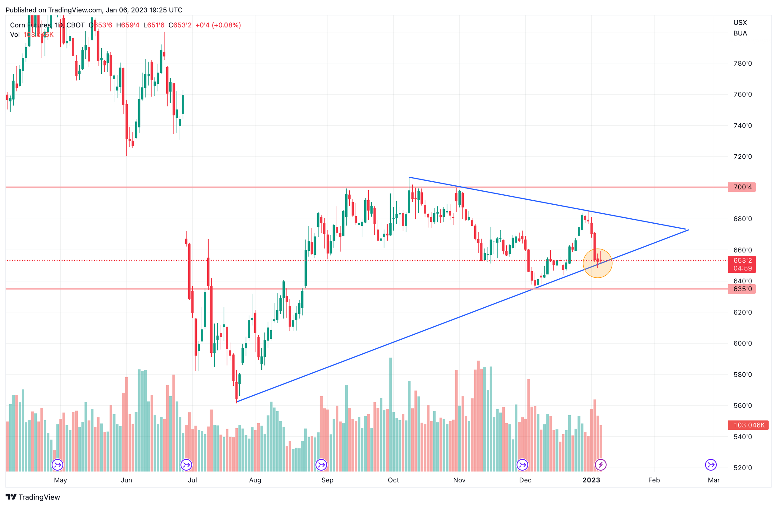 Here is a technical analysis from Friday showing the triangle in corn. As you can see we are still in an uptrend from the end of summer. On Friday corn held its support of the trendline. I think we could definitely see prices bounce here and test the $6.70 to $6.80 range. But ultimately, the USDA will dictate the direction we go when Thursday comes.