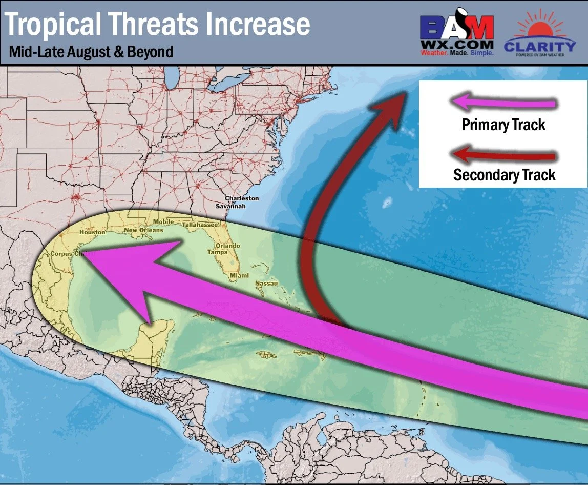 Big key to watch into August will be tropical activity. There may be something to watch late the first week of August in the southeast (would be a hotter/drier Ag Belt risk if it verifies) but confidence is increasing for a very active period mid-late August for the tropics (see image).