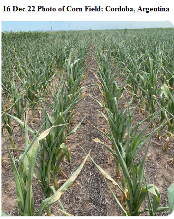 Argentina is still facing problems which has been a supportive factor in the markets. Below this write up I will include a picture of the corn crop in Cordoba, Argentina so one can see how serious their drought has been and the damage it has caused. Image courtesy of Wright on the Markets. It makes one question that it doesn’t really matter if they get rain or not now, the damage might already be done.