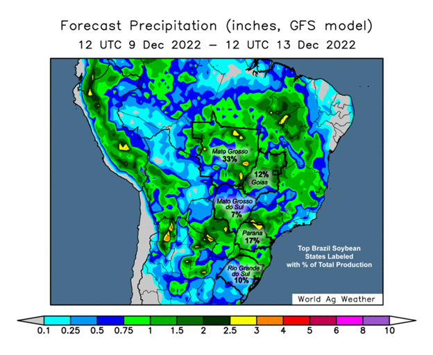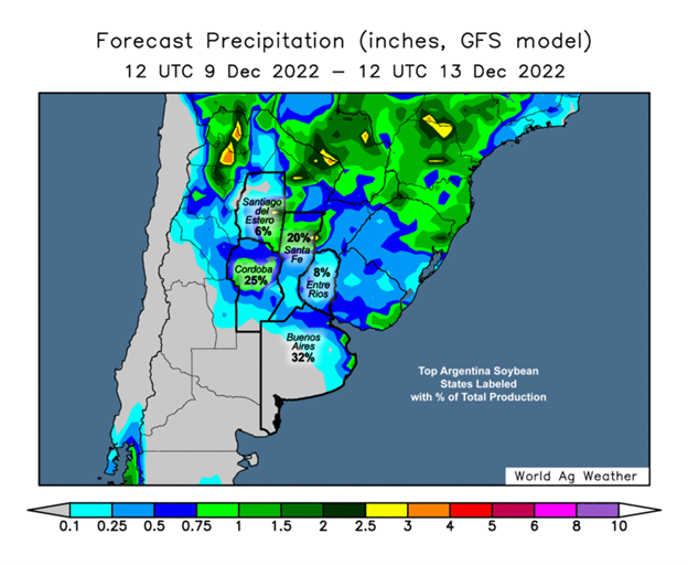 Last month we saw the USDA lower their Argentina production estimate to 49.5 million metric tons, down from 51 million. There is a solid chance we may continue to see this number lowered as Argentina planting is still far behind pace.