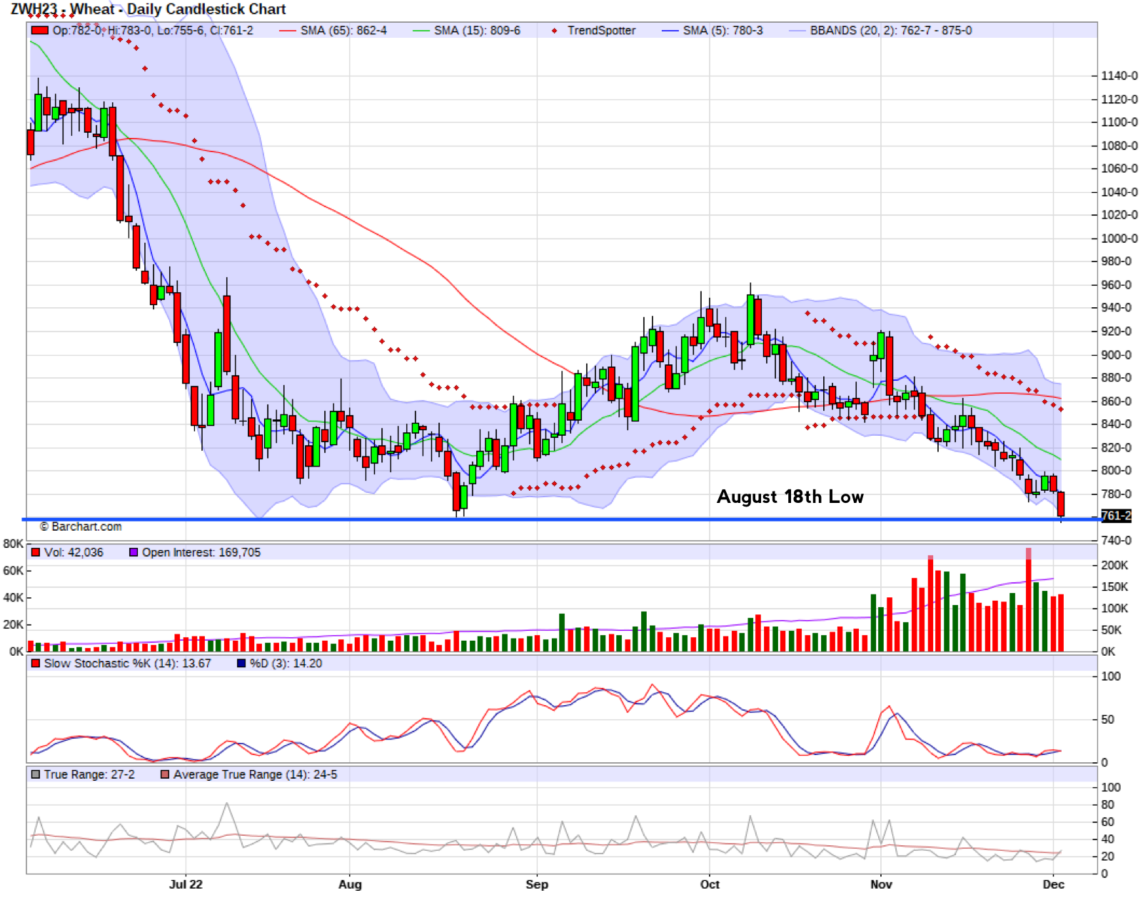 We are now sitting very close to some support at the $7.60 1/4 level which was our low we saw back on August 18th. So bulls would like to see prices hold above that range otherwise we have to look for additional support from our lows all the way back on January 14th of $7.48 3/4. Looking to the upside, one would like to think we see buyers step back in here. But I think we need prices to break the $8 mark to see the charts look more enticing and see more upside. We got close on the rally this week seeing a high of $7.96 3/4 but since we have seen wheat continue to make new lows.