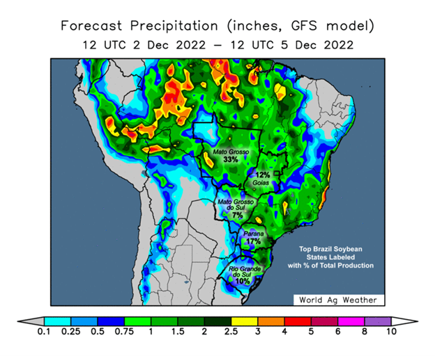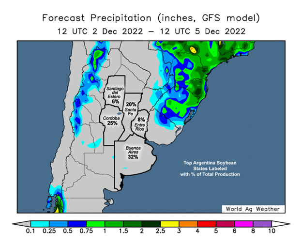 Taking at Brazil. They are still projected to see a massive record crop, with production estimates still sitting at record levels. With their weather forecasts not giving any optimism of a weather scare as they look pretty favorable for the crop. Argentina on the other hand has seen a lot of struggles, but are expecting to see some rain. But this doesn’t change the fact that 1/3 of the early planted beans in Argentina are already in regular to poor condition due to their dry weather.