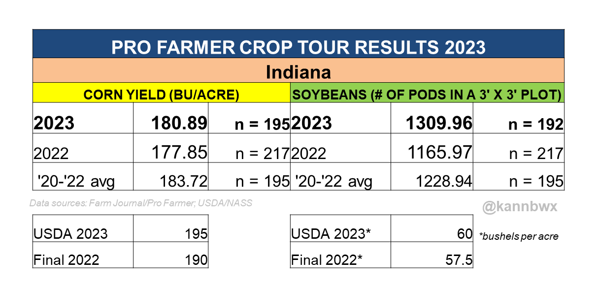 Indiana corn yield came in below average but also above last year's. However, their beans were solid, showing well above average pods.
