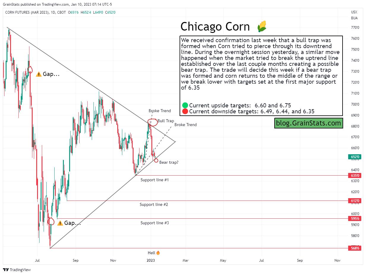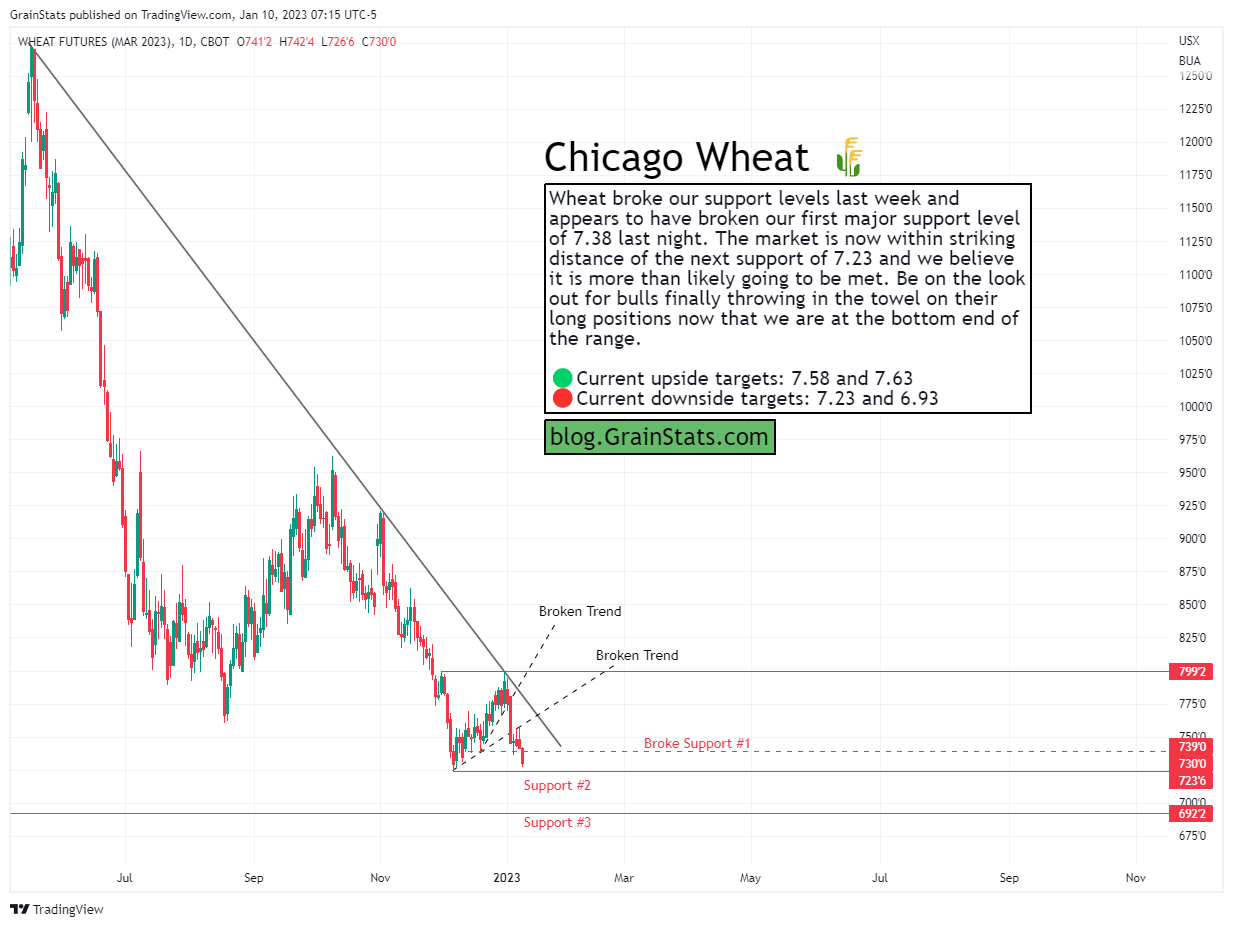 Overall, short term there isn't really anything friendly for the wheat market. Today we did manage to hold support and close above our December low. To get wheat trading higher short term and prove the trade wrong we will likely need a bullish surprise in the report. Otherwise, if we get a bearish report we could break some support and trade even lower from these lows. If wheat does take another sizeable step back after the report, I think that gives us all the more power to get in at a good price for when higher prices hopefully come in the months following. As there is still a chance Russias exports are being slightly over exaggerated and Ukraines production and exports are also slightly overly optimistic. We also have the war that still remains a possible bullish wild card. Lastly we also have the chance to see Russia run into some winter kill. So short term, yes I think we definitely have the chance to see more downside, but I still hold a bullish tilt looking long term.