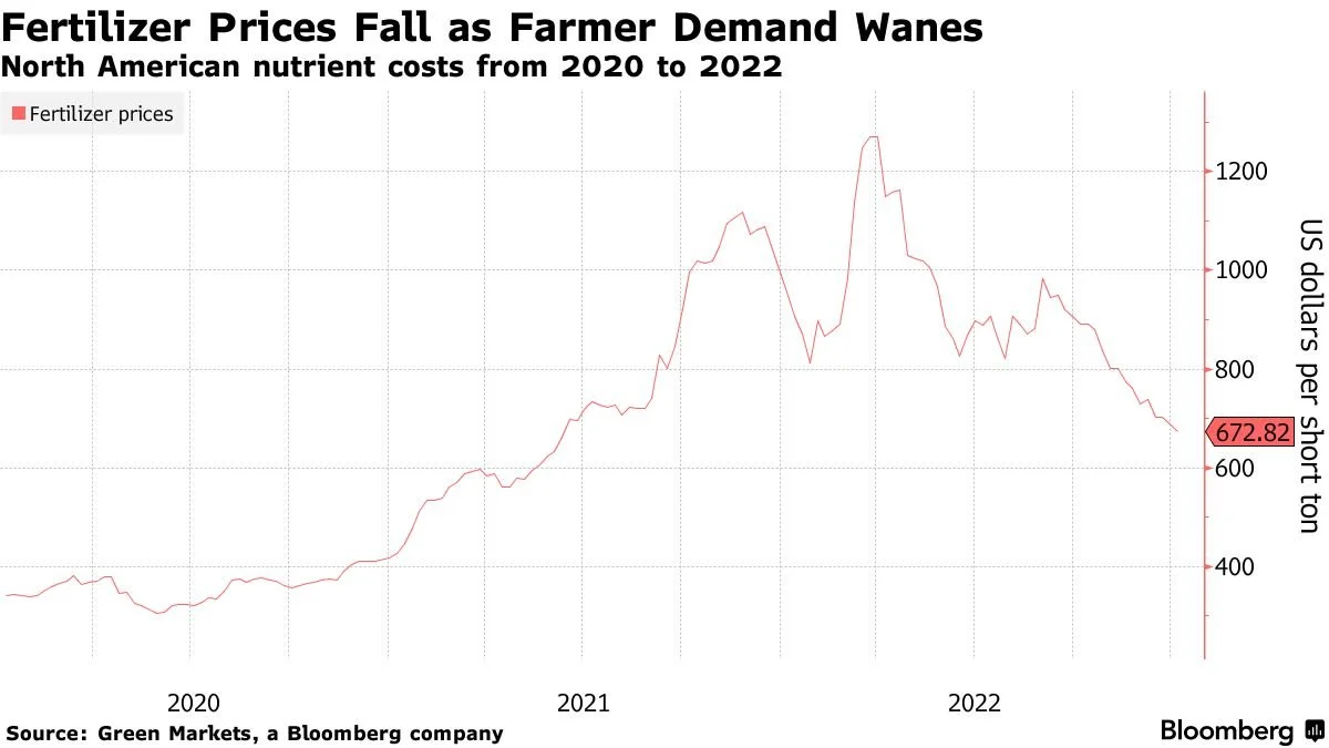 Fertilizer prices are falling after hitting records in 2022 as gas costs and farmer demand both decline.
