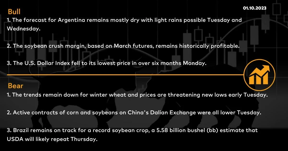 Wheat saw the most pressure with Russia aggressively selling for cheap compared to the U.S. prices. Wetter Argentina forecasts added additional pressure to beans.