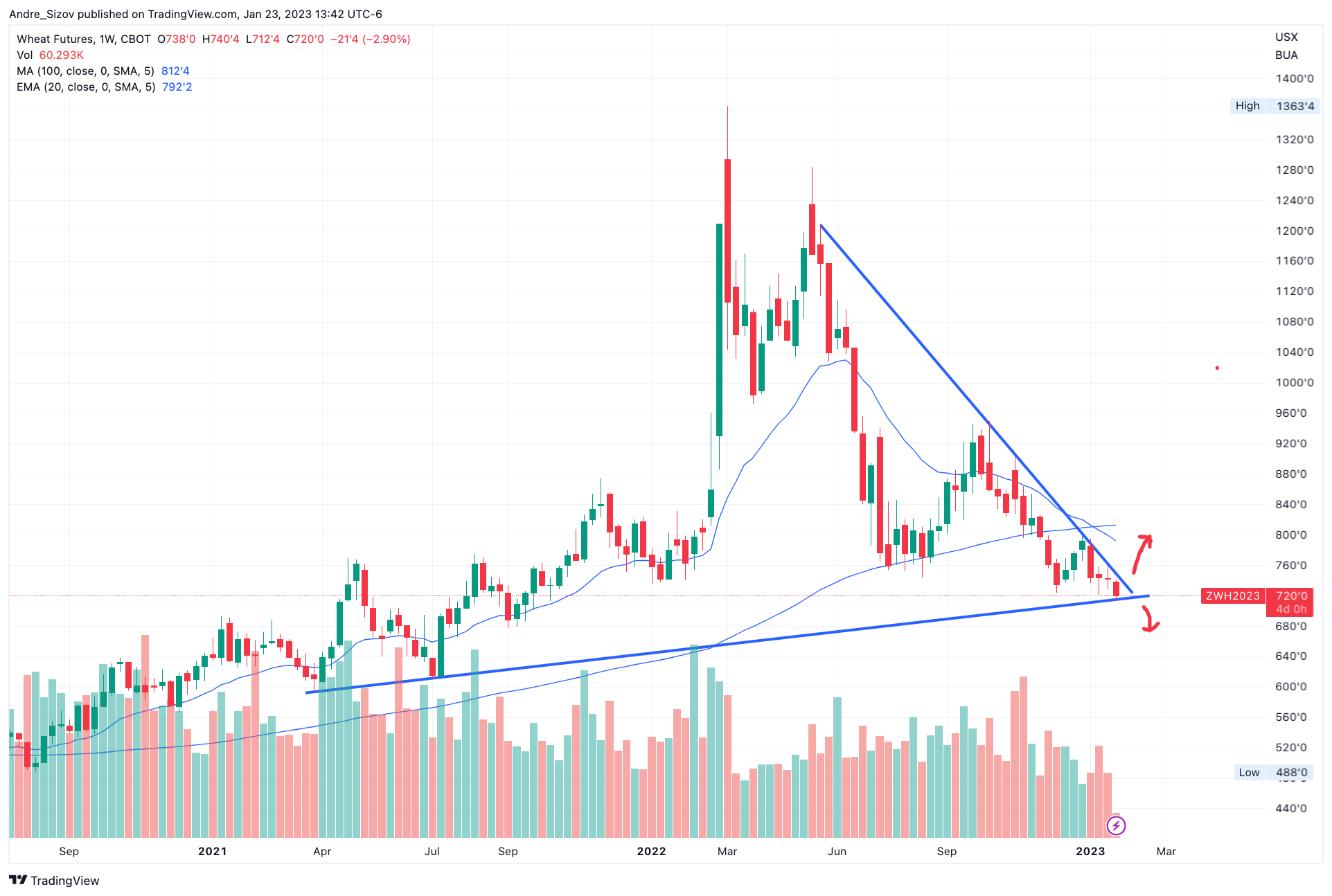 Here is a 3 year Chicago wheat chart from Andrey Sizov (SovEcon). As you can see from the chart, wheat is entering a apex that could from a technical perspective dictate the direction we go.