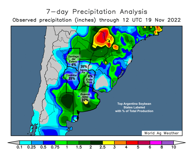 It’s looking like Brazil is expecting a large crop. But we can’t ignore the problems Argentina has been facing. The rain over the weekend in Argentina adding some pressure to prices today. As for the U.S. with harvest almost complete, there isn’t really any weather scare left for the U.S. crop.