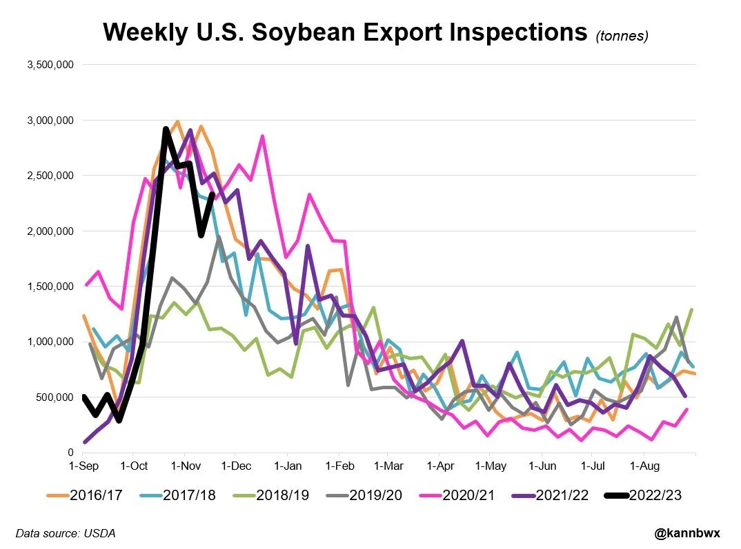Overall Chinese demand has been fairly quiet. But we did see pretty decent exports. They were "good" but not necessarily "great". As soybeans came in at 2.329 MMT, which was near the upper range of the trade estimates and above last weeks 1.964 MMT.