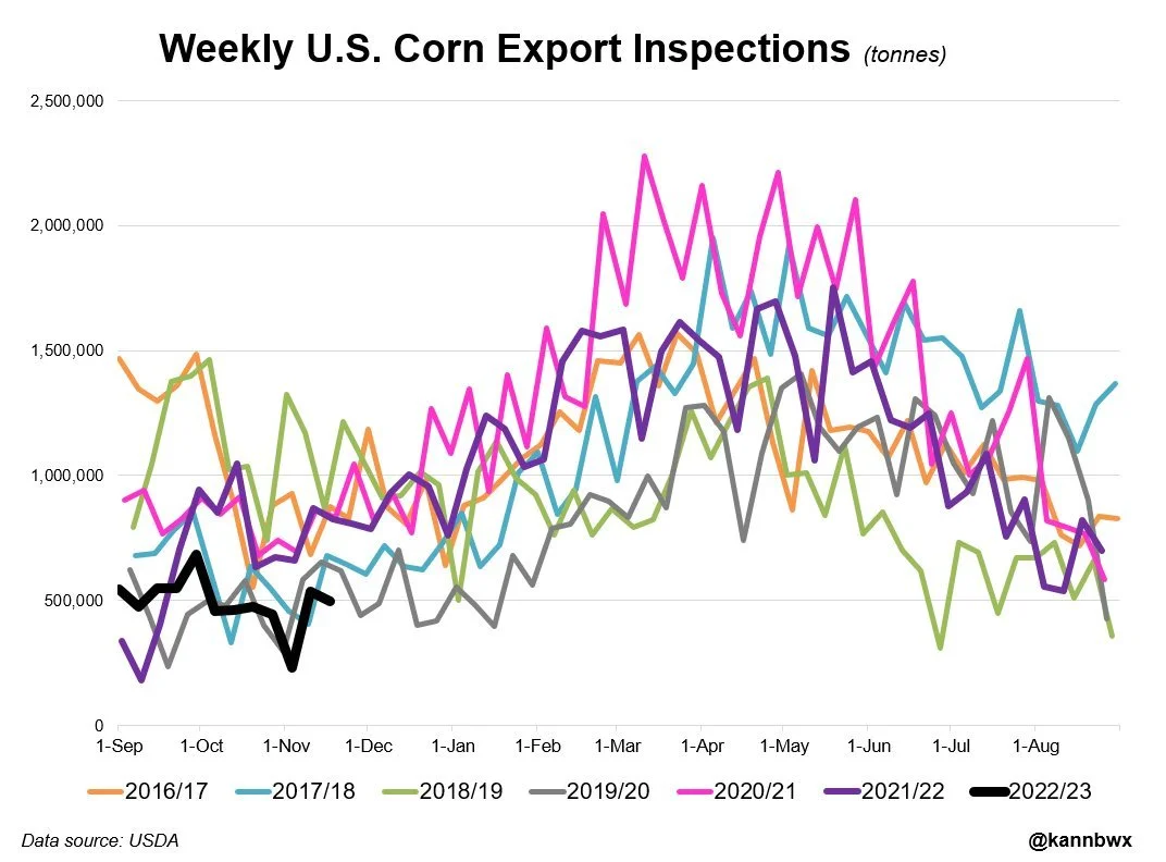 China's corn imports fell -58% year to year. The Sep-Oct total of 2.1 MMT is over 50% off the 2021/22 pace.