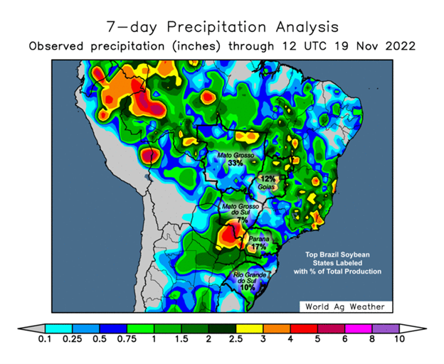 Taking a look at Brazil, their forecast is calling for more rain this week and early next week. So with this rain and overall not very threatening forecasts, we could see this put some pressure on soybean prices later this week going into next week.