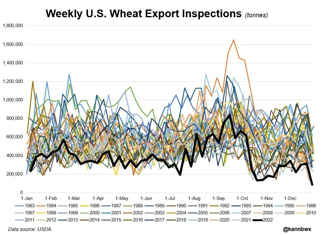 U.S. export inspections come in very disappointing across the board, with both soybeans and wheat coming in below expectations and corn on the light side of well. Wheat saw some all-time low volume.