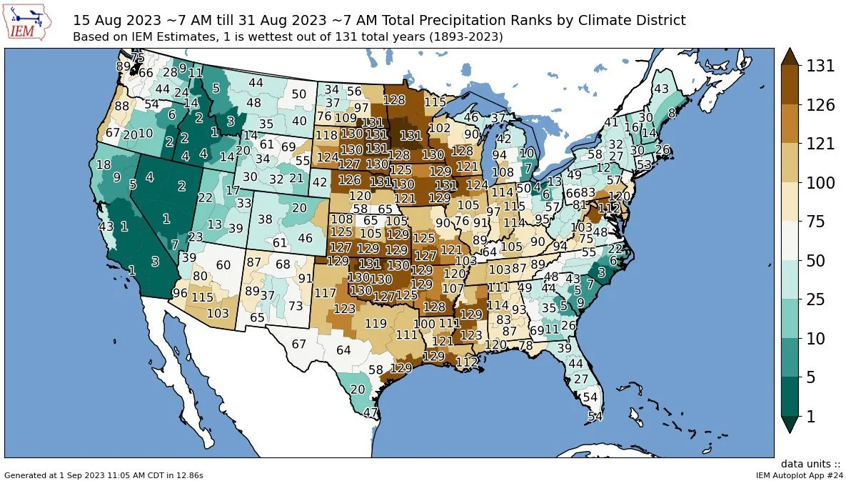 Here is how the second half of August ranks up against the last 131 years in terms of precipitation. Nearly the driest on record for a good portion of the corn belt, out of 131 years.