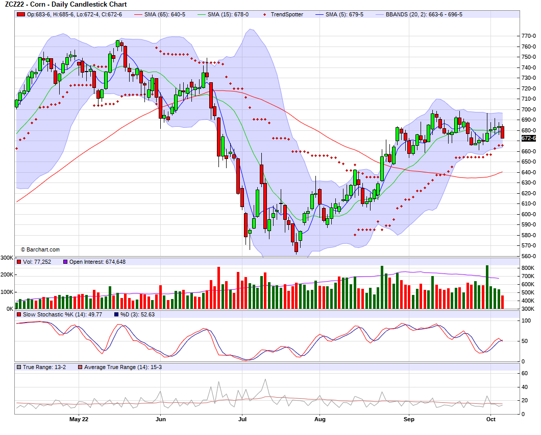 Harvest looks like its going smoothly. The yield stories are really a mixed bag. Some are saying yields are better than expected, some saying they are worse. Of course if yields come in worse we will likely see higher prices. But if we see demand increase I don't think $7+ corn is out of the realm of possibility. Up until today, we where seeing higher highs and lower lows, and corn had closed higher the last six out of seven trading days. Even with today’s losses, we are still higher than we were just a week ago. However, its tough to be super bullish on the demand side of things with China interest not being there, the dollar trading so high, and the recession concerns still looming leading to a lack in consumer demand.
