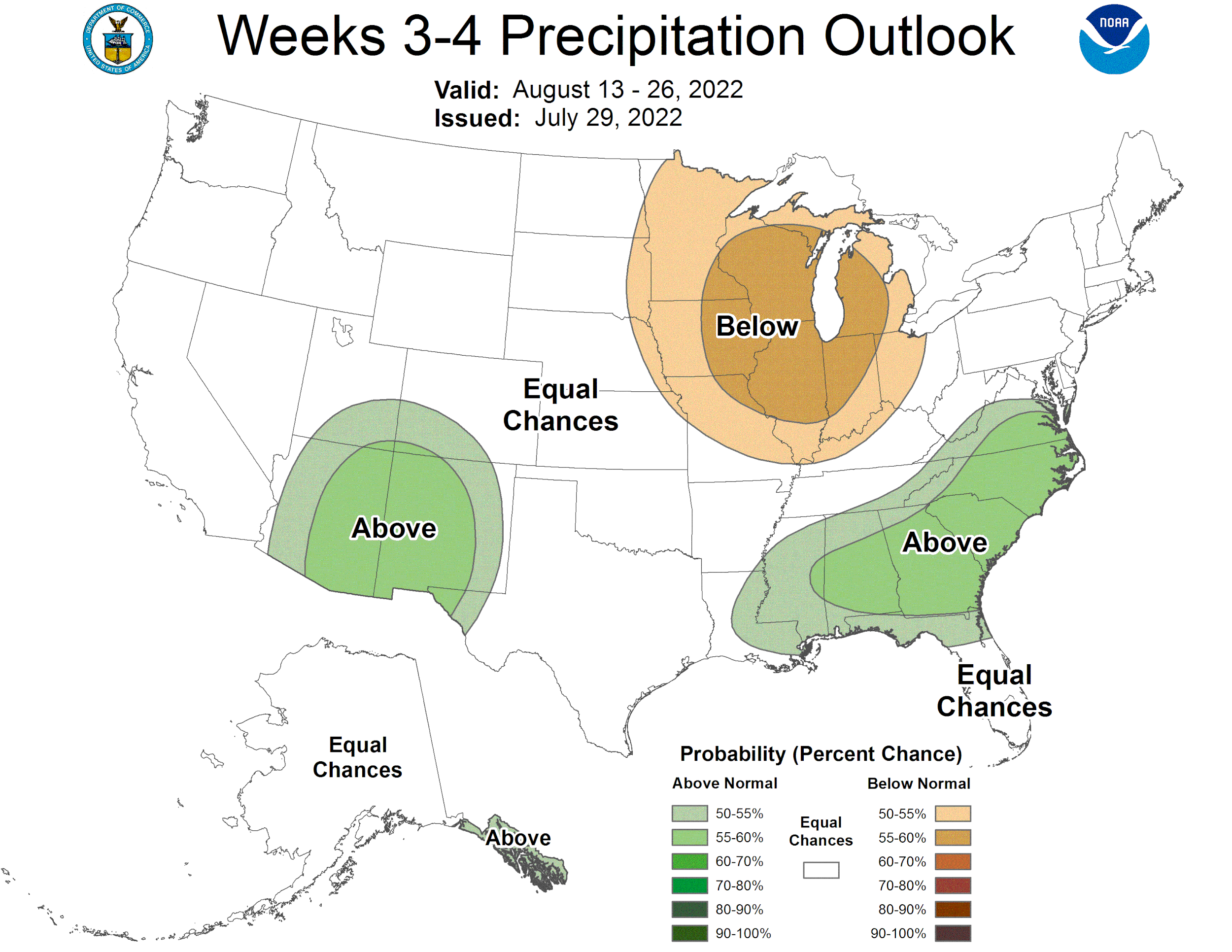 However, it appears we are looking at another wave of heat and dryness across the majority of the Midwest for the next two weeks. This is the main support carrying the corn and bean markets currently. Last week we saw the USDA lower overall U.S. crop conditions from 64% down to 61% rated good/excellent.