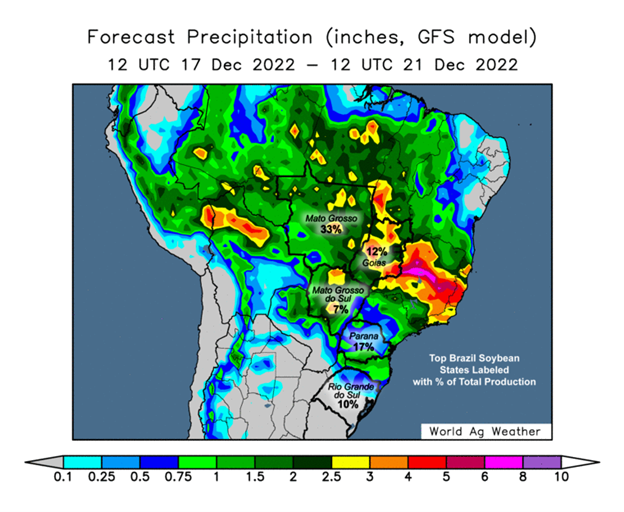Brazil is expected to see above average rainfall the next week or two. While Argentina is expected to remain fairly dry for the same time frame with chances of rain past that. Overall outlook remains about the same as it has been. Argentina is looking hot and dry which is bullish for the most part as of right now while Brazil remains cooperative which is on the bearish side of things.