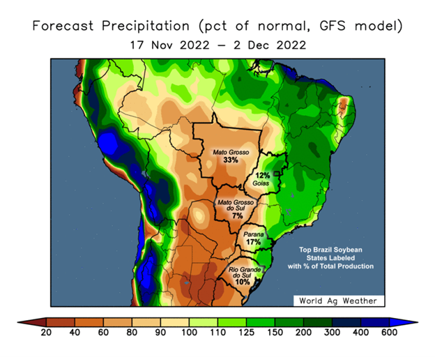 Brazilian weather is looking cooperative for the most part here. But this is always subject to change. They are starting to see a little more rain up north and a little less down south. Going forward, my only concern with soybeans is that Brazil is still expecting a rather large crop. Which could hurt U.S. demand in the future. But of course, we do have that possibility for weather scares to combat the large crop.