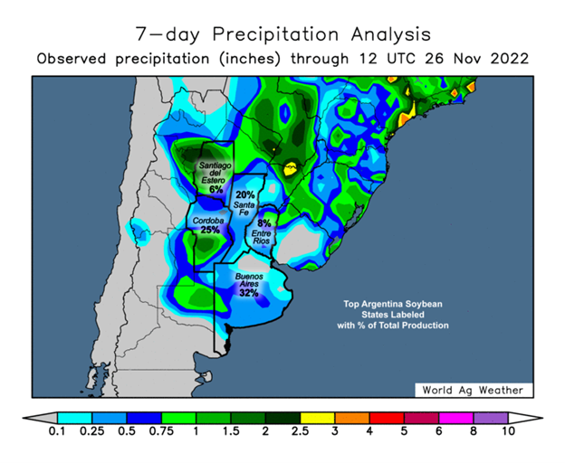 Weather in South America looks pretty good for the most part. Although Argentina did see some pretty scorching temps of 104 degrees F over the weekend. Buenos Aires Grain Exchange has Argentina soybean crop at 19% planted vs the 40% average. So their soybean crop has been severely delayed, mostly due to drought. This along side Chinese demand will continue to be one of the bigger factors going forward.