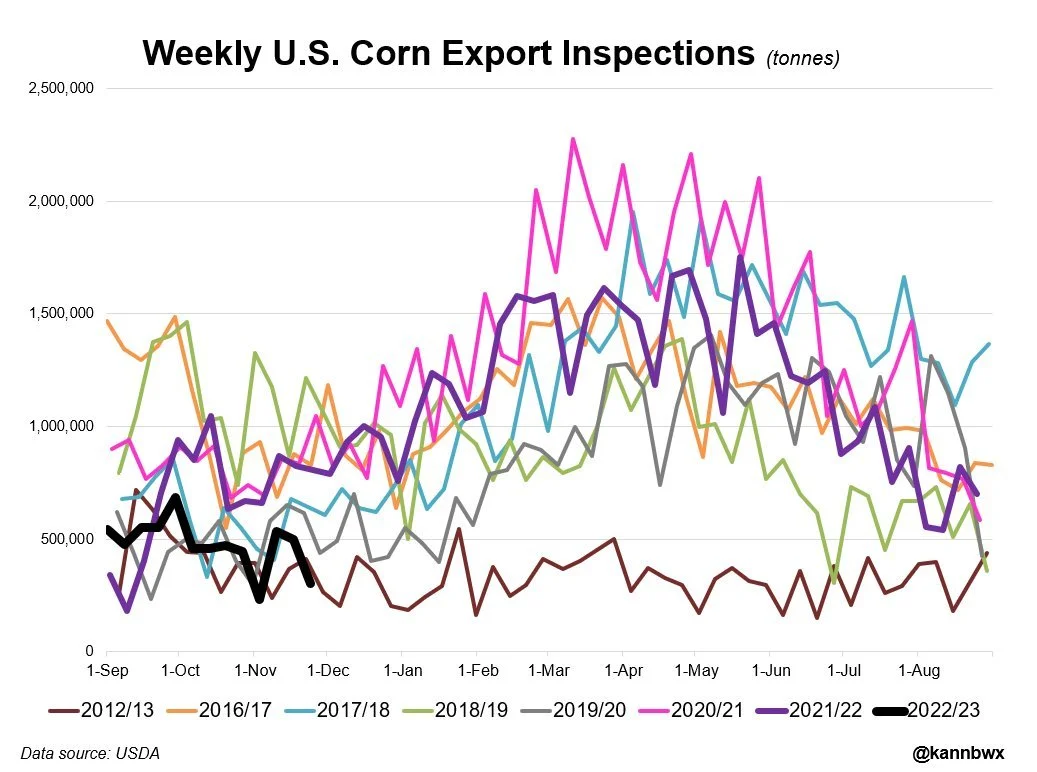 Last week we saw corn export sales hit a year high but are still severely behind the USDA pace, currently 250 million bushels or 12% behind pace.