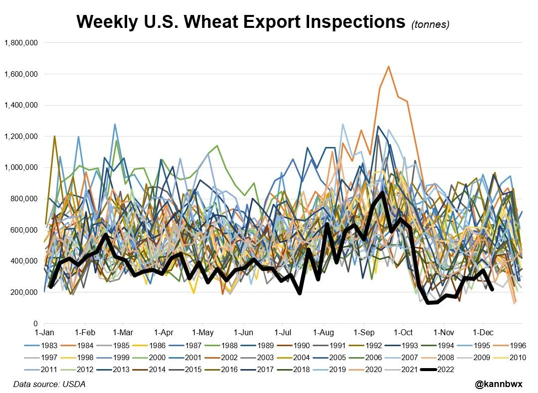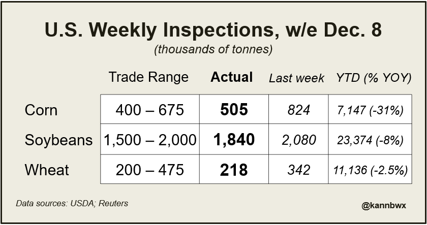 U.S. export inspections nothing special. With all numbers within trade estimates. But we did see pretty big upward adjustments in corn and soybeans. If wheats number holds, this will be the lowest ever for a week.