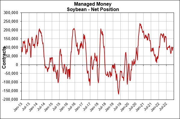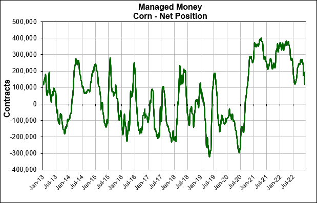 Last week we saw corn drop to a low that was driven by fund selling, looks like they may have stopped selling as we saw a bottom on Wednesday and have slowly climbed higher since. Spec funds current net long position in corn is the smallest it’s been since October of 2020.