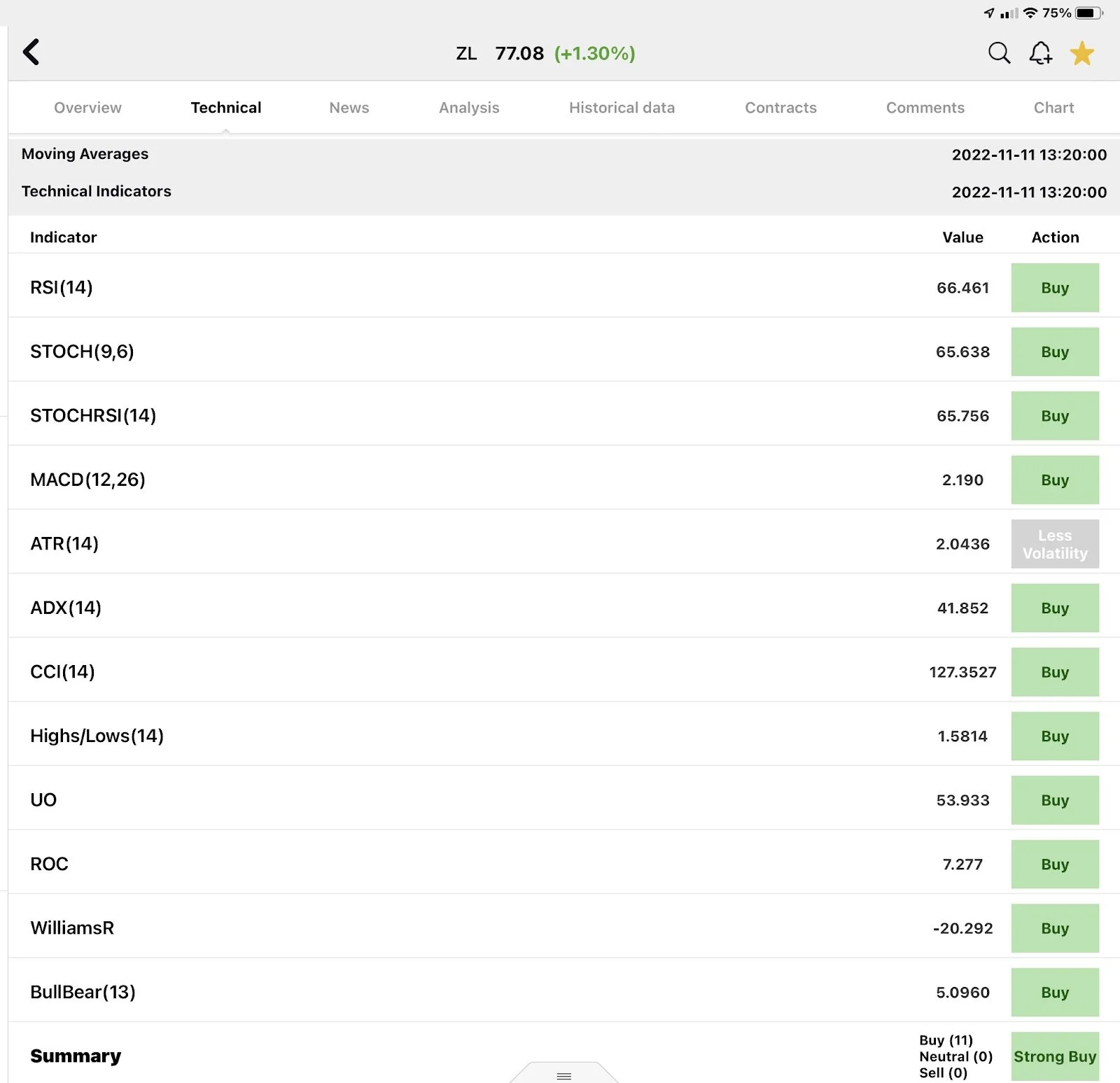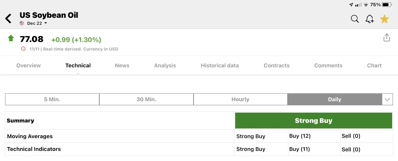 This new one is still soybean oil, but it is from the investing.com app. It has 11 buy indicators.