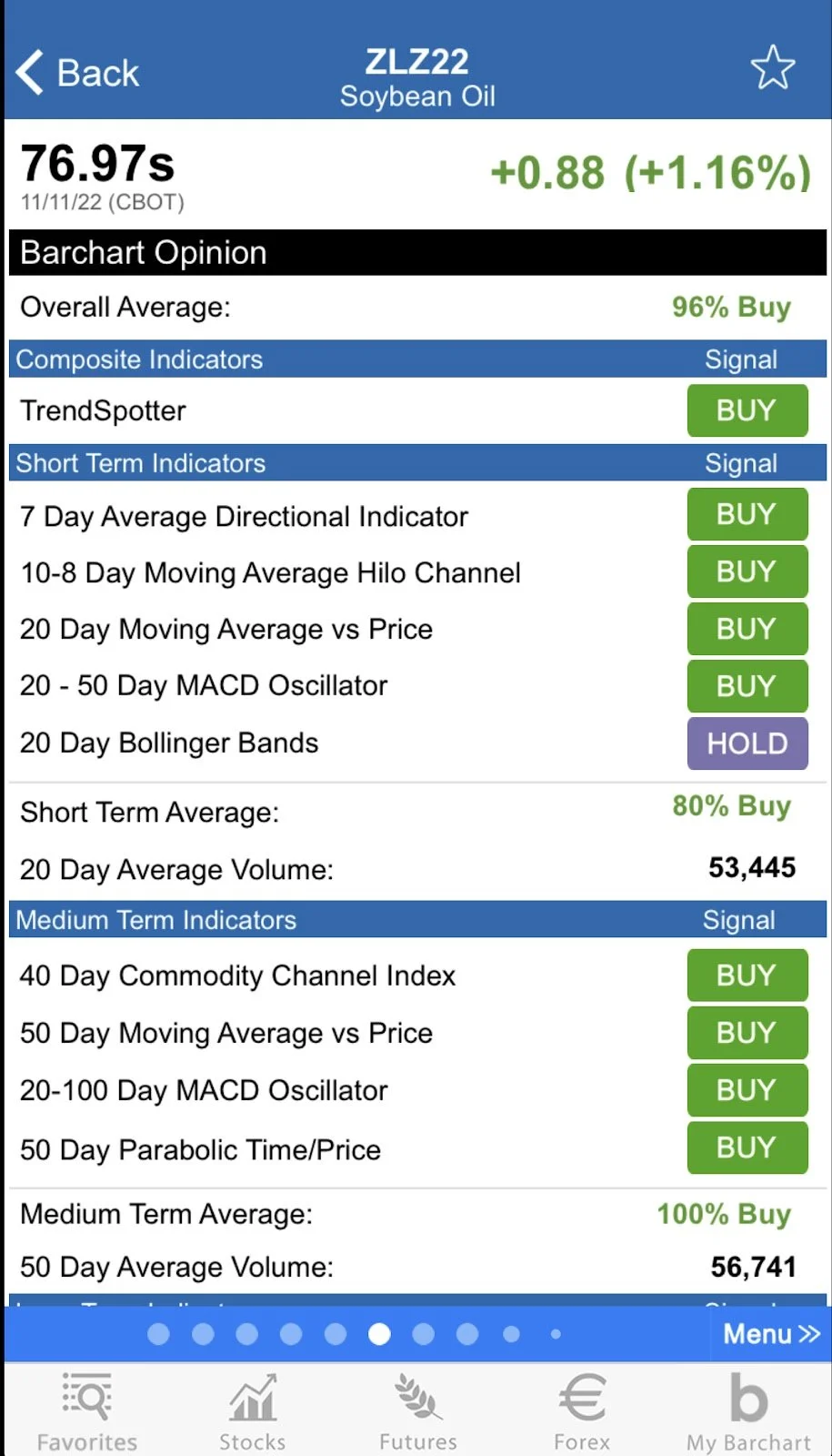 This next screen show is a technical opinion from the Barchart app. Notice they have soybean at 96% buy.