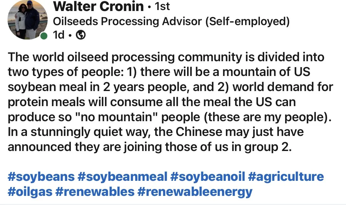 Below is from Walter Cronin from LinkedIn. I think he is on to something very major and that is “world demand for protein meals will consume all the US can produce…….the Chinese may have just announced they are joining” that they will consume all that the US can produce. This is major and is just one more reason why I think we will see new all-time highs for most of the grain markets in 2023.