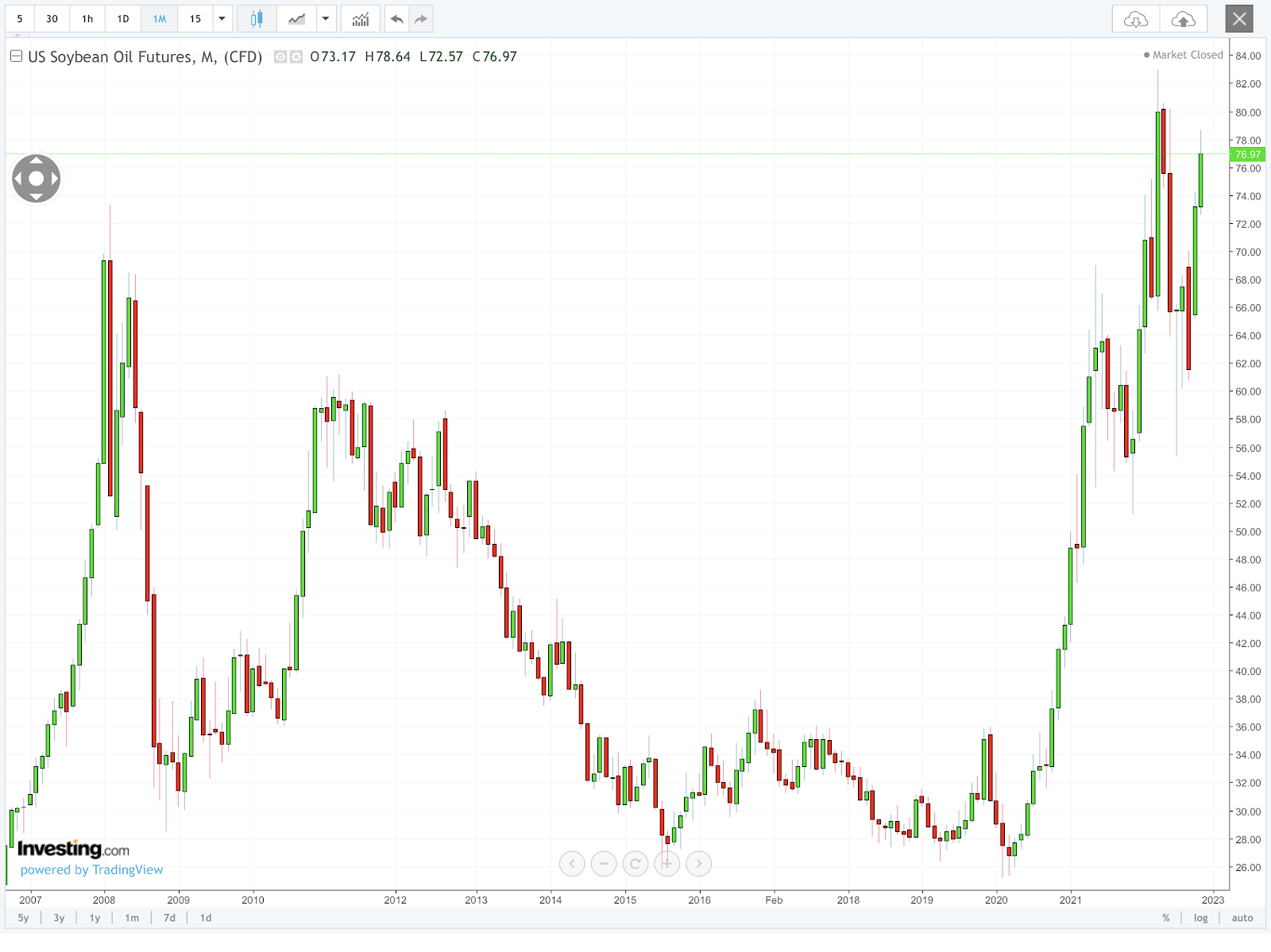 This next chart is a monthly soybean oil chart. This shows how much stronger bean oil is from a historical perspective. Well above 2008 and 2012 levels and within reach of the all-time highs we had just a few months ago.