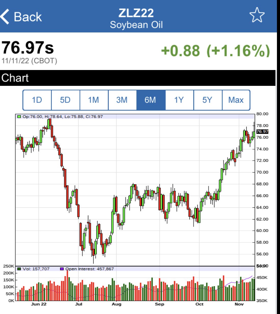 This first chart is a daily soybean oil chart. You can see we had an upside breakout day on Friday, making a new high for the move. This is off of the barchart.com app.