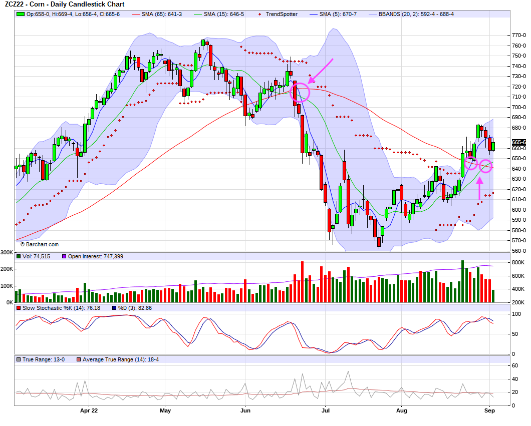 Moving average cross over, buy Dec Corn with a stop at the 15-day moving average.