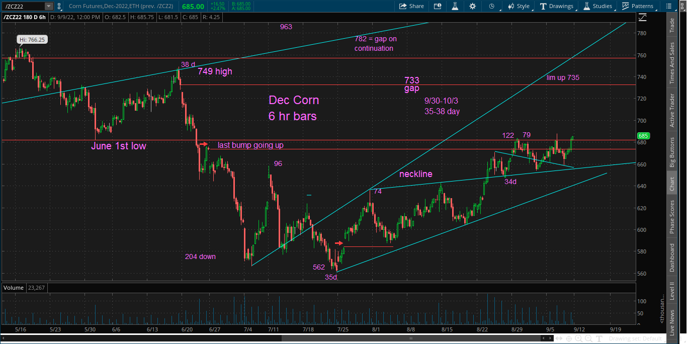 "The Dec Corn chart is in a steady uptrend, consistently marking higher highs and lows - momentum is up, so it would take a bigger force to stop the up movement. Support comes in at 659. Resistance is the gap at 733 then 749 above that."