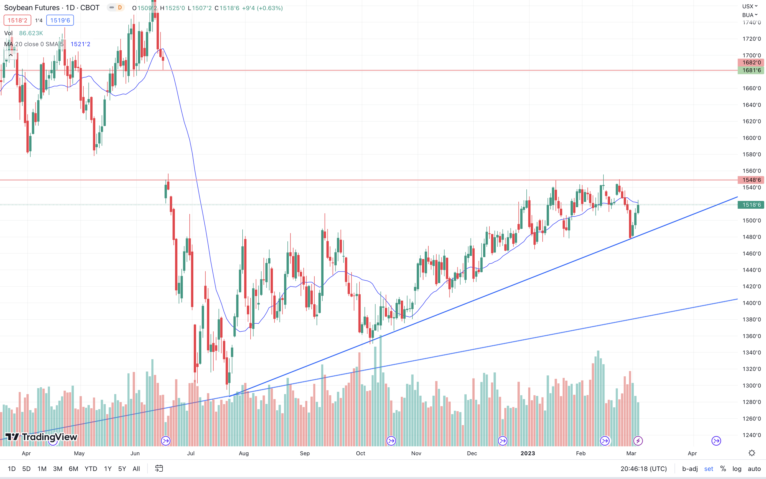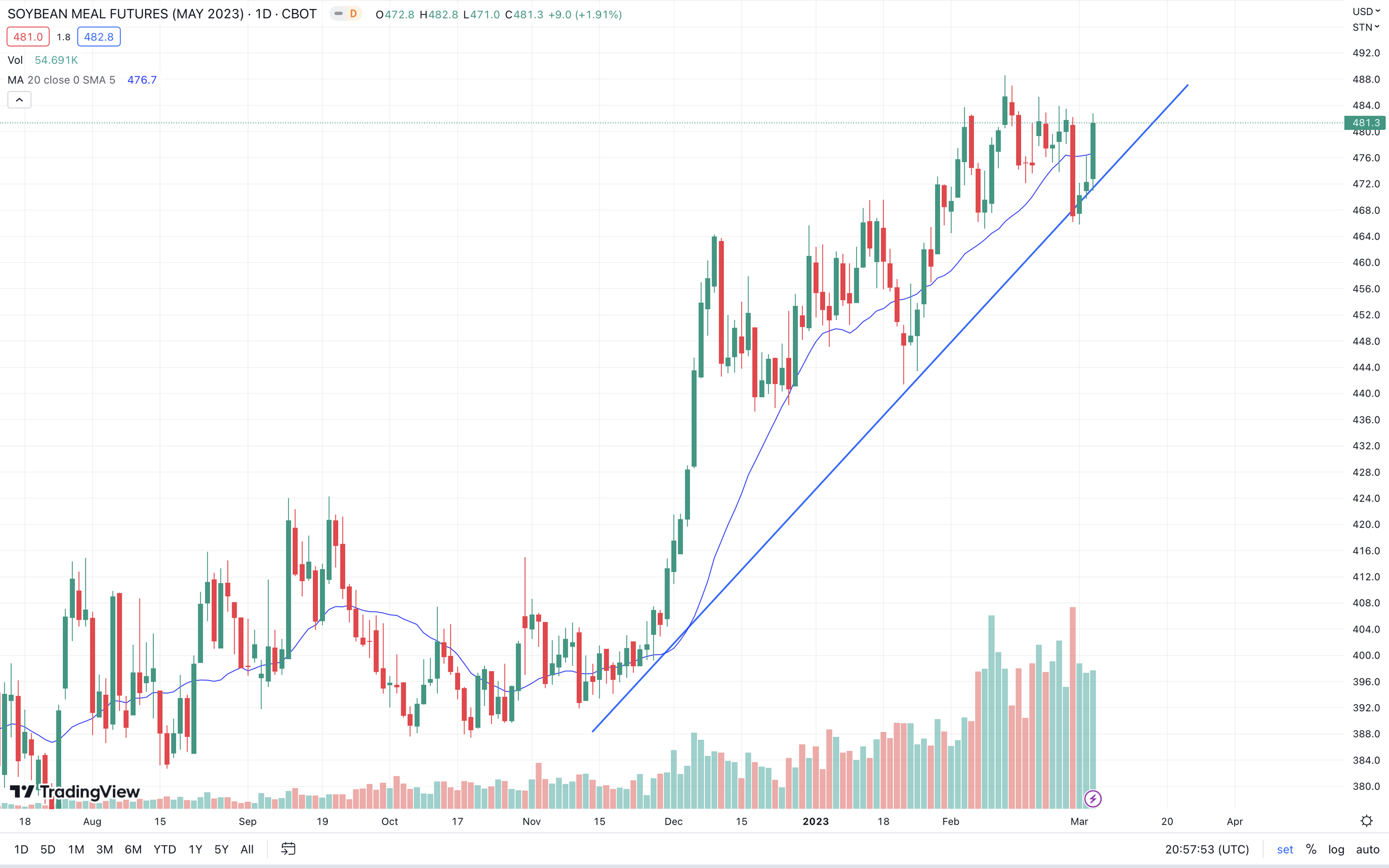 Meal continues its strength off the back of Argy worries (the world’s leading exporter of meal). Finding support at our uptrend from our initial rally in late November.