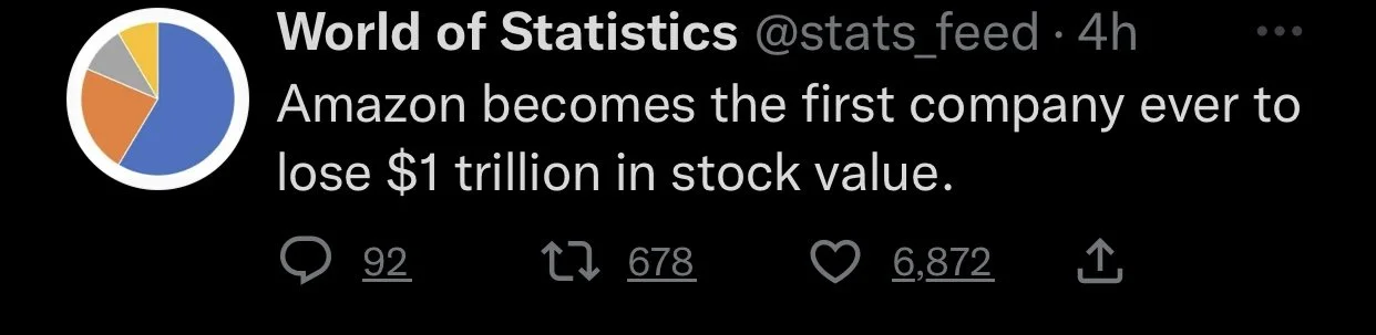 Amazon is set to lose $1 trillion in market value after its cap sank to $879 billion. Down from its all time high of $1.9 trillion in July 2021.