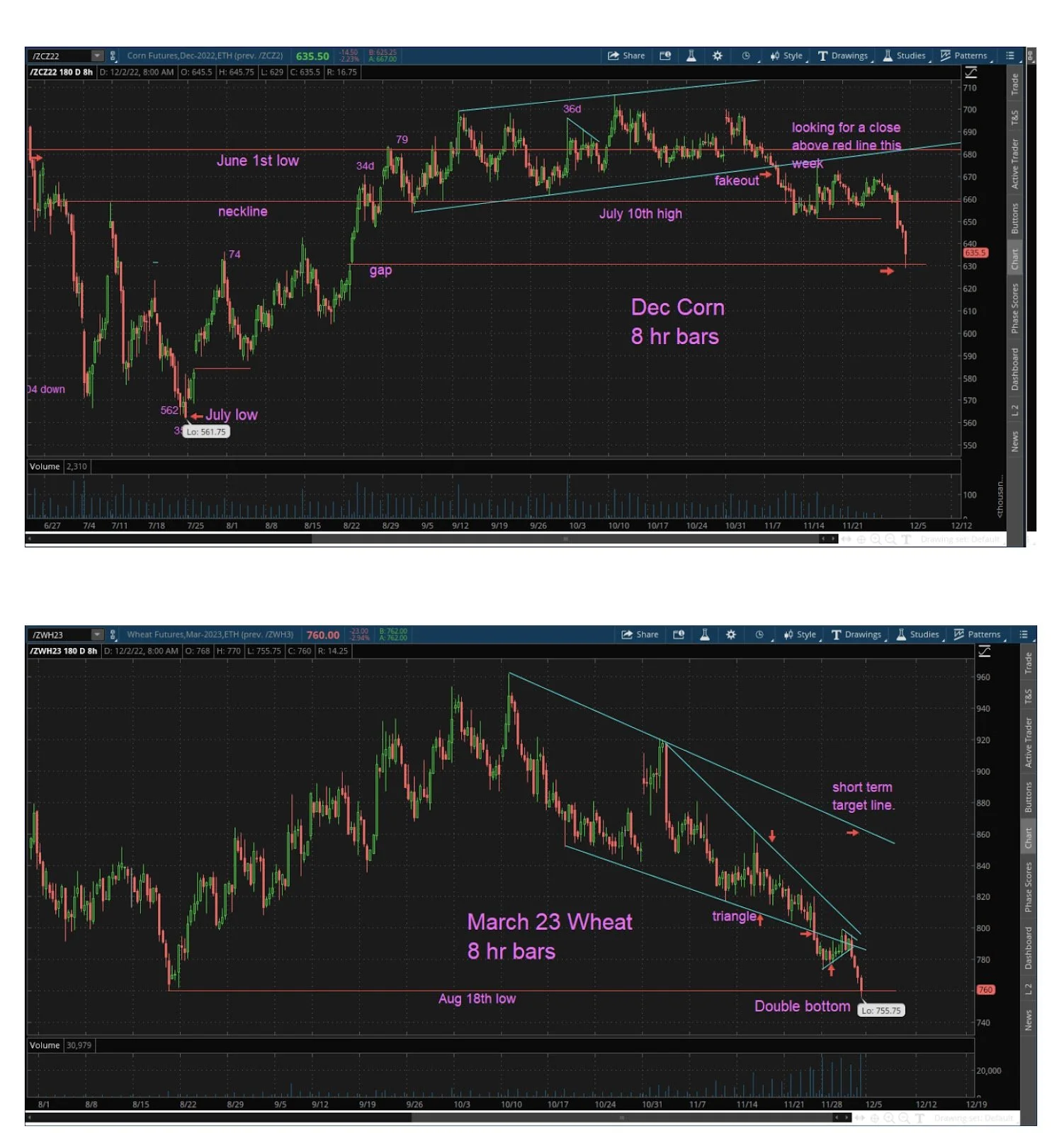 Here are the Dec Corn and March Wheat charts, respectively.