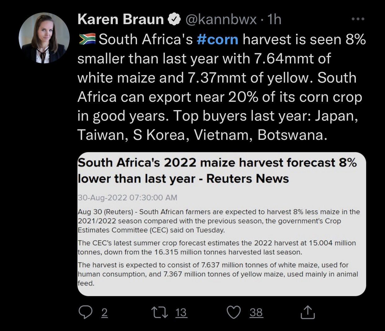 The biggest takeways were the decrease we saw in corn, lowering ratings by 1%. While soybeans remained unchanged. We also saw spring wheat ratings jump 4% which is a pretty big move this late in the year.