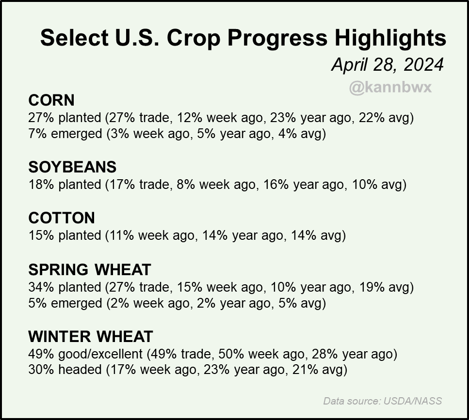 Corn and bean planting came in as expected, but ahead of average. Spring wheat planting pace is the fastest since 2021 and was faster than expected and the average pace.